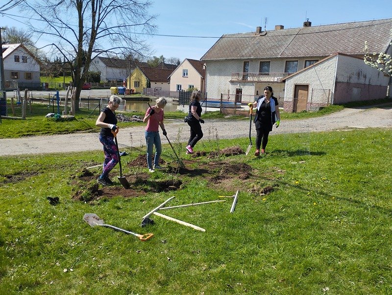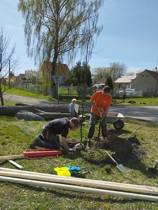 Jámy byly předkopané, takže práce postupovala svižně. Některá místa ale přinesla překvapení – místy byl terén hodně kamenitý, jinde se u studny objevila voda. Stromy proto našly své místo o kousek dál a do vlhčích jam obec později vysadí vrby. I takové drobné změny patří k práci v terénu a připomínají, že každé místo má svá specifika.