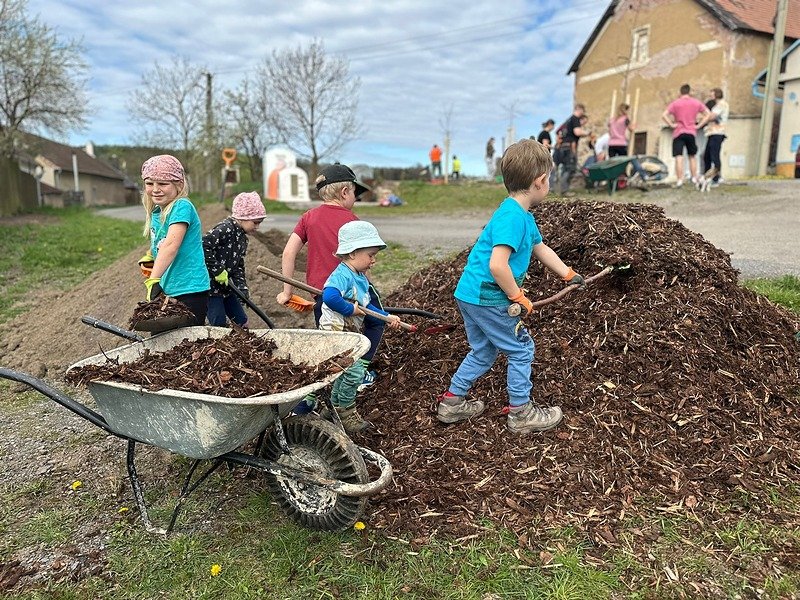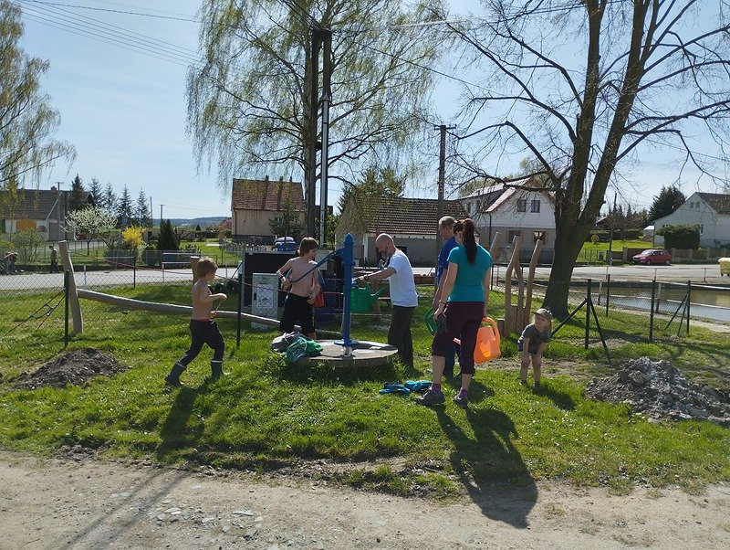 Jak šel čas a slunce sílilo, děti si daly pauzu od práce a objevily kouzlo místní studny. Ta je v Občově stále funkční, a tak se zalévání stalo zábavou i přirozenou součástí dne. Po dokončení výsadby čekalo všechny bohaté občerstvení, opékání špekáčků i vegetariánských variant na novém ohništi a možnost posedět v obecní budově, kde příjemně chladilo a voněla domácí polévka.