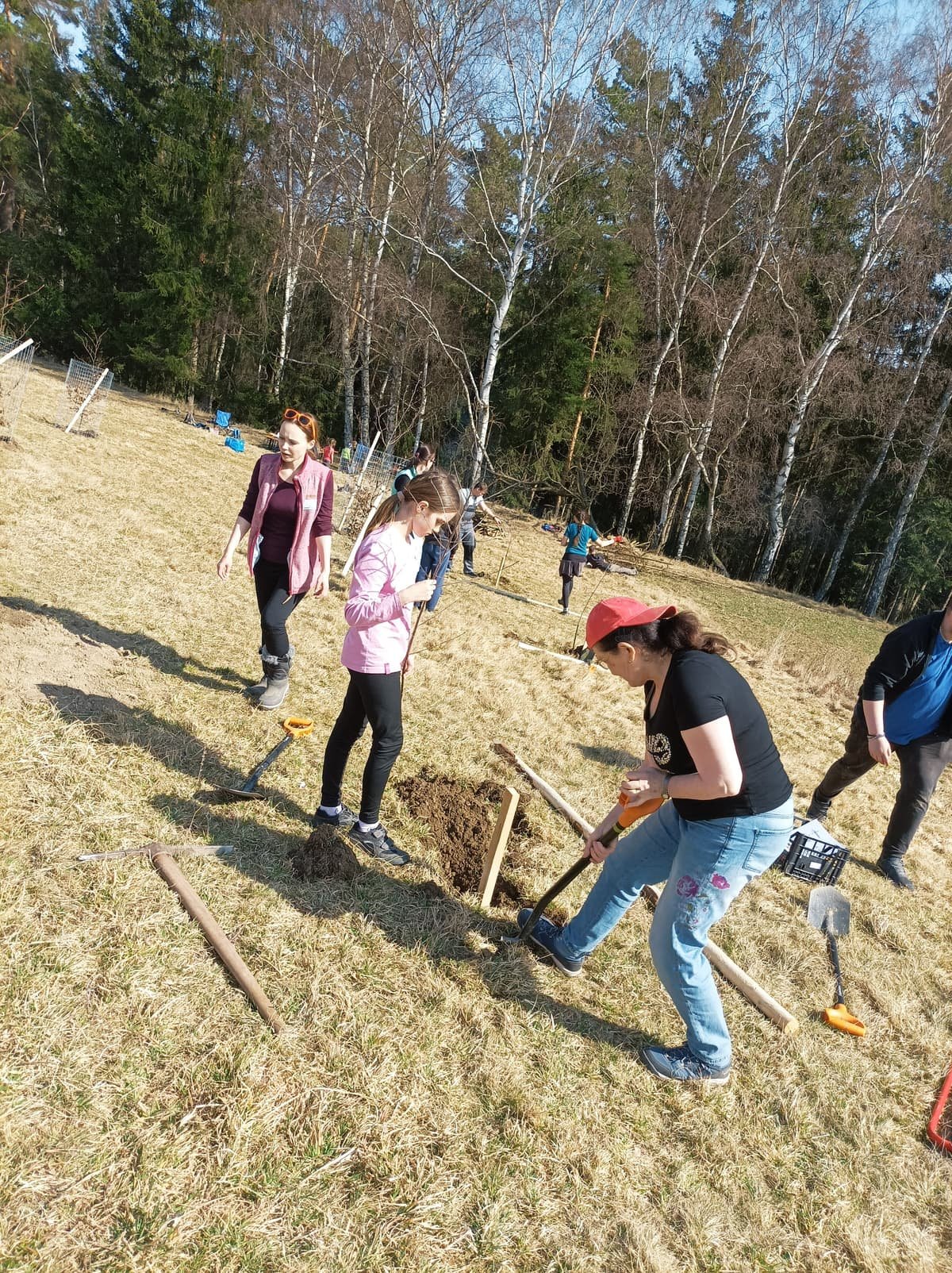 Po úvodní ukázce správné výsadby se všichni pustili do práce. Někde bylo potřeba sázet s kůly našikmo, jinde připravovat oplocenky, další skupiny se věnovaly keřům. Panovala výborná nálada, práce ubíhala rychle a krátce po poledni už byly všechny stromky v zemi.