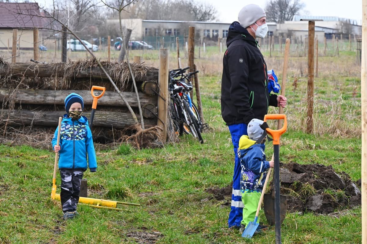 V sobotu se u Štolmířského potoka postupně scházeli místní myslivci, hasiči i rodiče s dětmi. Na místě už byly připravené ukázkové výsadby stromků na několika stanovištích, aby se všichni mohli v klidu zaškolit v menších skupinkách a osvojit si správný postup sázení.